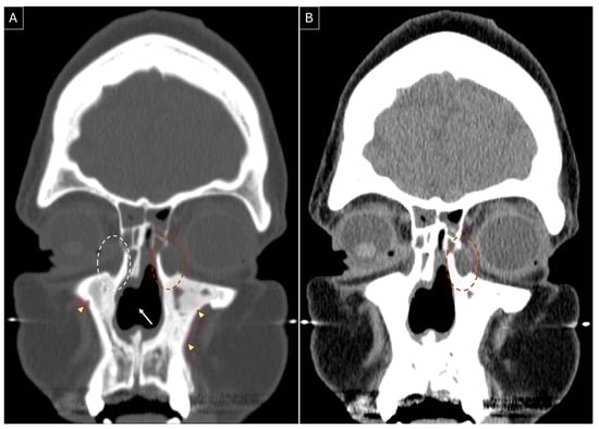 Figure 2. Non-contrasted sinus CT, coronal section, showing left-sided dacryocystocele (red dotted circle) in contrast to the right-sided lacrimal sac (white dotted circle). Presence of a nasal septal perforation (white arrow) and osteitic bone remodelling (red arrowheads) can be noted in both bone (A) and soft tissue (B) windows.