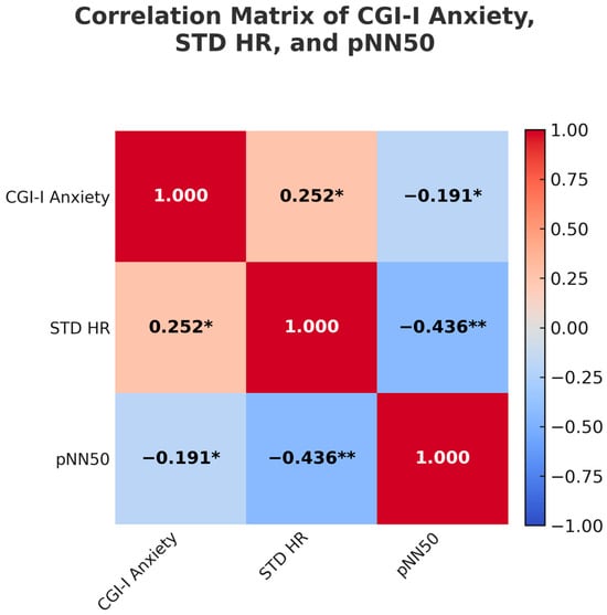 Correlation matrix illustrating relationships among Clinical Global Impression. Improvement (CGI-I) for anxiety, standard deviation of heart rate (STD HR), and percentage of normal RR intervals that differ by 50 milliseconds or more (pNN50). Asterisks indicate statistically significant correlations: * p < 0.05, ** p < 0.01.