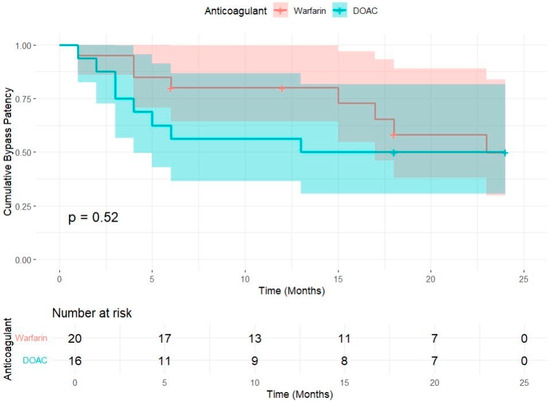 Our study compared the two-year patency rates of autologous vein bypasses in patients receiving either warfarin DOACs. The Kaplan–Meier survival analysis revealed that the mean bypass patency was longer in the warfarin group (18.3 months) compared to the DOAC group (14.3 months); however, this difference was not statistically significant (p = 0.524). Notably, during the first year post-surgery, the DOAC group experienced a higher incidence of bypass closures or significant stenosis. By the 24-month mark, the patency rates between the two groups converged. Multivariable analysis using a Cox proportional hazards regression model, which accounted for factors such as age, sex, comorbidities, type of bypass, and concomitant antiplatelet therapy, did not identify any variables with a statistically significant impact on event occurrence.