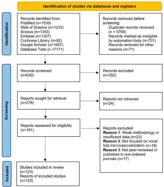 The search strategy involved the use of specific keywords, including microvascularization, vocal folds, Reinke’s edema, capillary permeability, endothelial cells, pericytes, and vascular signaling. Boolean operators (AND, OR, NOT) were applied to refine the search results, along with filters to limit studies based on publication date, relevance, and peer-review status. Articles were selected based on their contribution to the historical understanding of vocal fold microvascularization and its pathophysiological implications. The screening and inclusion of studies are summarized in Figure 1.