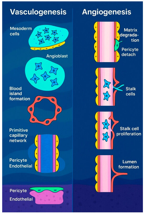 According to the literature, all embryonic blood vessels originate from extraembryonic precursors that expand through continuous budding, branching, and elongation, a process known as angiogenesis [9]. This mechanism closely parallels tumor vascularization [9,10] and wound-induced neovascularization [11]. However, subsequent studies identified intraembryonic endothelial vesicles forming independently within the splanchnic mesoderm. Unlike blood islands, these vesicles do not originate as mesenchymal aggregates and, with few exceptions [12], are not associated with blood cell precursor formation. These differences have led some researchers to propose that intraembryonic endothelial vesicles may instead represent transient extensions of vascular structures originating externally [13]. New blood vessels form through two primary processes: vasculogenesis and angiogenesis. Vasculogenesis involves the de novo assembly of endothelial cells into vessels, as seen in the formation of the dorsal aortae, aortic arches, and cardinal veins [14,15]. Some networks initially develop as capillary plexuses, which later remodel into hierarchical structures to meet tissue demands, such as the perineural plexus and the capillary plexus of the yolk sac. The yolk sac plexus connects the blood islands, the first site of blood formation, to the embryo [16,17]. In quail, endothelial cells from blood islands sprout and interconnect, while in mice, primitive blood cells initially associate loosely with angioblasts before endothelial differentiation ensheathes them [18,19]. Intraembryonic vessels, however, form independently through angioblast coalescence. Although vasculogenesis is essential in early vessel formation, the precise role of angiogenesis in these early stages remains unclear, requiring further investigation. However, as development progresses, angiogenesis plays a progressively dominant role in vascular formation.