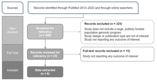 Studies meeting inclusion criteria represented diverse populations with varied levels of healthcare system nationalization. The majority of included articles examined the value of population genomics in countries with established programs, including the United Kingdom (3), the United States (2), and Australia (1) [22,23,24,25,26,27]. The remaining two articles examined the value of PGPs from a global perspective [28,29]. Characteristics of the included articles are presented in Table 1. All articles included benefits to health outcomes as a central value element of PGPs, as well as cited applications to promote health, included screening, diagnosis, pharmacogenomics, personalized treatment, and management. The value of genomics to education and research was also cited in all articles and included benefits to improving research and development. Several articles referenced the direct and indirect value of PGPs through company creation, investment, employment, and productivity through a healthier workforce. More than half of the articles (63%) included one or more financial outcomes as a benefit to PGPs. Non-human applications of genomics in agriculture, the environment and national security were less cited areas of value. Two articles highlighted the role of genomics as part of public health strategies for the COVID-19 pandemic.