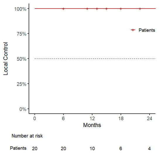 With a median follow-up of 15 months (range, 6–59), our 1-year LC was 100% (95% CI: 100–100%), with two local failures reported after 28 and 31 months, respectively, and both treated with a second course of SBRT (32.5 Gy in 5 sessions) (Figure 1).