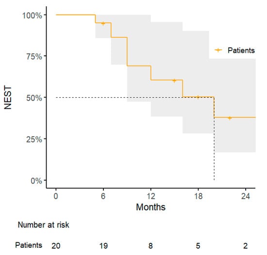 The administration of SBRT for peritoneal/abdominal wall oligometastases lead to a 1-year TNTS rate of 61% (95% CI: 38–96%), with a median time to next systemic treatment of 8 months (range, 6–47 months) (Figure 4).