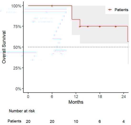 The median overall survival (OS) was 12 months (range, 6–59), with a 1-year OS rate of 83% (95% CI: 65–100%, Figure 5). Statistical analysis revealed that patients with abdominal wall lesions had significantly improved OS compared to those with peritoneal lesions, with a significant association identified using Fisher’s exact test (p = 0.03), and confirmed by log-rank test (p = 0.01). Similarly, patients who experienced sequential oligometastatic progression and were treated with a second course of SBRT showed improved OS; the association was significant (p = 0.04), and survival benefit was confirmed by log-rank analysis (p = 0.04) (Table 4, Table 5 and Table 6).