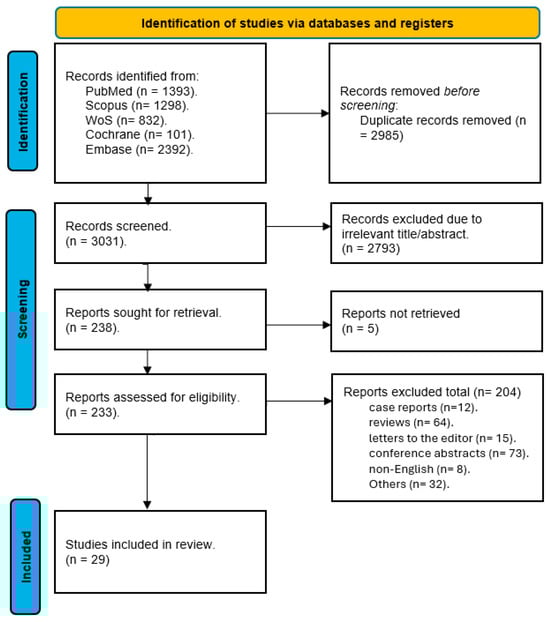 We conducted a comprehensive literature search across the five major databases: PubMed, Scopus, Web of Science, Cochrane CENTRAL, and EMBASE. The initial search yielded a total of 6016 records. After removing duplicates and irrelevant records, we screened 3031 unique studies for eligibility based on their titles and abstracts. We excluded 2793 studies that did not meet our inclusion criteria. We obtained the full-text articles of the remaining 238 studies for further assessment. After applying the predefined criteria, we excluded 209 studies for various reasons, such as lack of relevant outcomes, inappropriate study design, or poor quality. Finally, we included 29 studies in our systematic review and meta-analysis. The flow diagram of the literature search and screening process is shown in Figure 1.