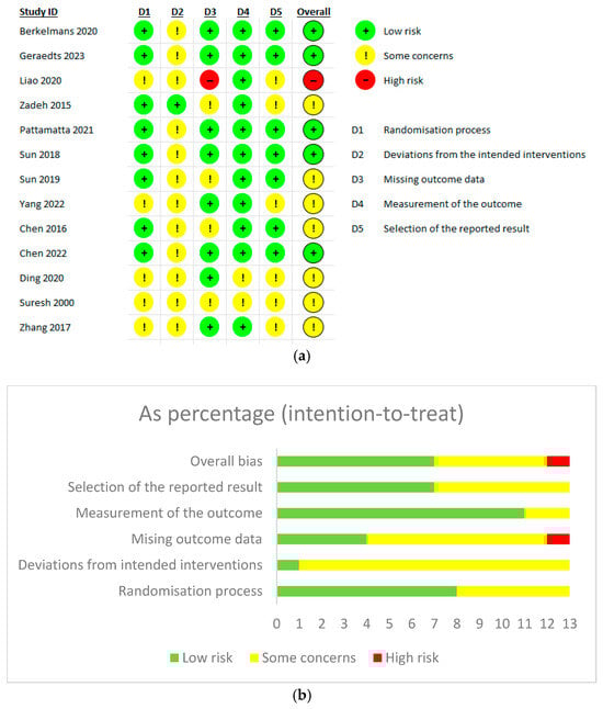 (a) Cochrane Risk of Bias Assessment tool 2 for randomized control trials. (b) Intention-to-treat analysis [8,10,11,20,21,22,23,24,29,30,31,38,40].