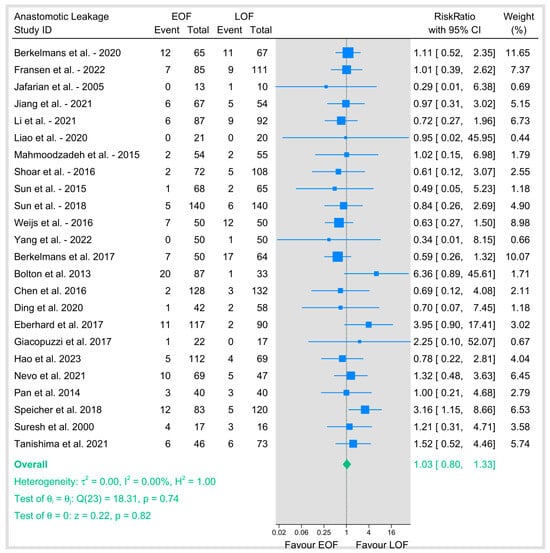 Our primary outcome of anastomotic leakage was evaluated across 24 studies, involving a total of 3166 patients (1585 in the EOF group and 1581 in the LOF group). The pooled risk ratio (RR) was 1.03 (95% CI: 0.8–1.33; p = 0.82), indicating no significant difference between the two feeding strategies (Figure 3). Heterogeneity was negligible (I2 = 0%, p = 0.74), suggesting consistency across studies.