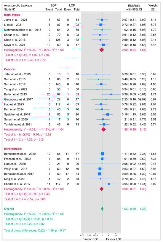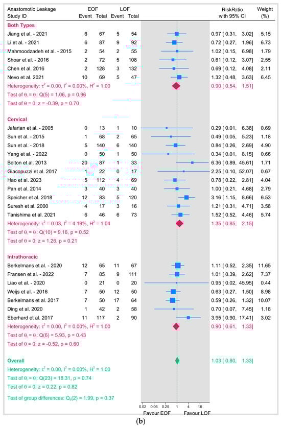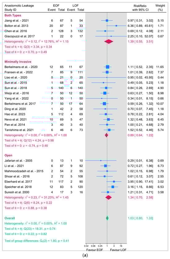 Studies that included both types of surgery showed a pooled RR of 1.39 (95% CI: 0.55–3.51; p = 0.49) with low heterogeneity (I2 = 12.76%, p = 0.34), and tests of group differences across surgical approaches was not significant (p = 0.41), indicating that the effect of EOF versus LOF on anastomotic leakage did not vary by surgical technique (Figure 4a).