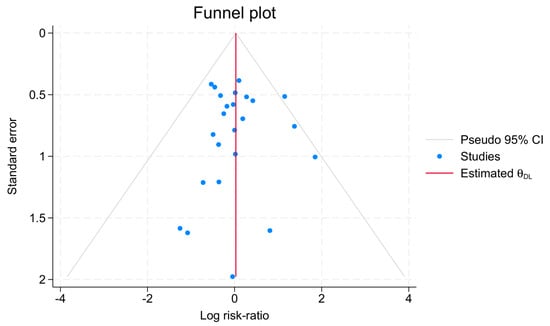Publication bias was assessed for anastomotic leakage using Egger’s regression test and the nonparametric trim-and-fill method. Egger’s test showed no evidence of small-study effects (beta1 = 0.05, SE = 0.528, z = 0.10, p = 0.923). The trim-and-fill analysis imputed zero studies, with the adjusted RR remaining identical to the observed RR (1.03, 95% CI: 0.796–1.333), indicating no significant publication bias. A funnel plot further supported symmetry and absence of bias (Figure 6).