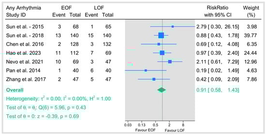 The RR of pooled incidence of arrhythmia is 0.91 (95% CI: 0.58–1.43), with no statistical difference between the EOF and LOF groups (p = 0.69). The analysis showed no heterogeneity (I2 = 0%) (Figure 8).