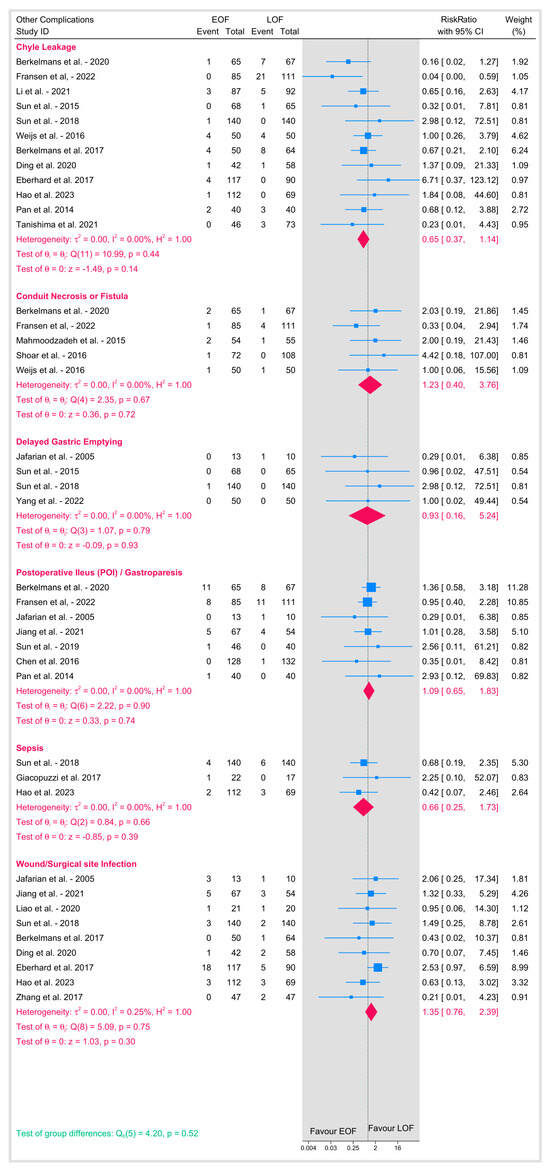 Additional complications, including chyle leakage, conduit necrosis or fistula formation, delayed gastric emptying, postoperative ileus (or gastroparesis), sepsis, and wound/surgical site infection, were also analyzed (Figure 9). The pooled estimates for these outcomes showed minimal heterogeneity (I2 between 0% and 0.25%), and all pooled RR were non-significant for each complication (e.g., chyle leakage: p = 0.14; conduit necrosis/fistula: p = 0.72; delayed gastric emptying: p = 0.93; postoperative ileus: p = 0.74; sepsis: p = 0.39; wound infections: p = 0.30). The overall test for differences across these complications was also not significant (p = 0.52), demonstrating that early oral feeding does not significantly alter the risk of these additional postoperative events when compared to late feeding.