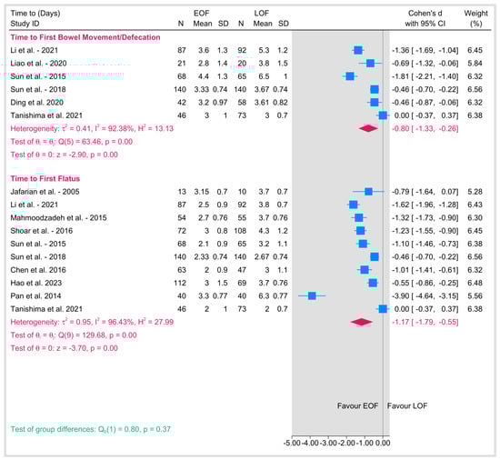 Similarly, nine studies assessed the time to first flatus as a marker of gastrointestinal recovery. The pooled Cohen’s d was −1.17 (95% CI: −1.79 to −0.55; p < 0.001), indicating a large effect favoring EOF, with a significantly shorter time to first flatus compared to LOF. Considerable heterogeneity was present (I2 = 96.43%, p < 0.001), suggesting significant variability across studies. Individual study effect sizes ranged from −3.90 as shown in Pan et al., 2014 [36] to 0 as shown in Tanishima et al., 2021 [39], highlighting variability in the impact of EOF on this outcome. A test of group differences between time to first bowel movement and time to first flatus showed no significant difference in the effect of EOF versus LOF across these two outcomes (p = 0.41).