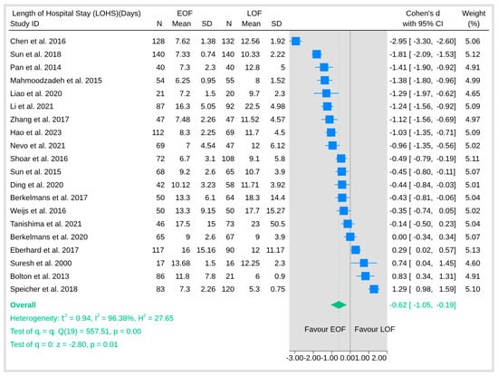 The pooled analysis of length of hospital stay was associated with a significantly shorter hospitalization duration in the EOF arm (Figure 11). The overall effect (Cohen’s d) was statistically significant (p = 0.01). However, the analysis also revealed substantial heterogeneity (I2 = 96.38%).