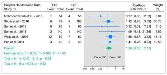 The pooled six studies that reported readmission rates revealed no significant difference between the two arms (Figure 12). The pooled risk ratio was not statistically significant (p = 0.53), and there was no evidence of heterogeneity among studies (I2 = 0%). These findings indicate that EOF does not significantly affect the risk of hospital readmission compared with LOF, supporting the overall safety profile of early oral feeding in postoperative management.