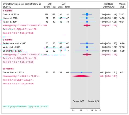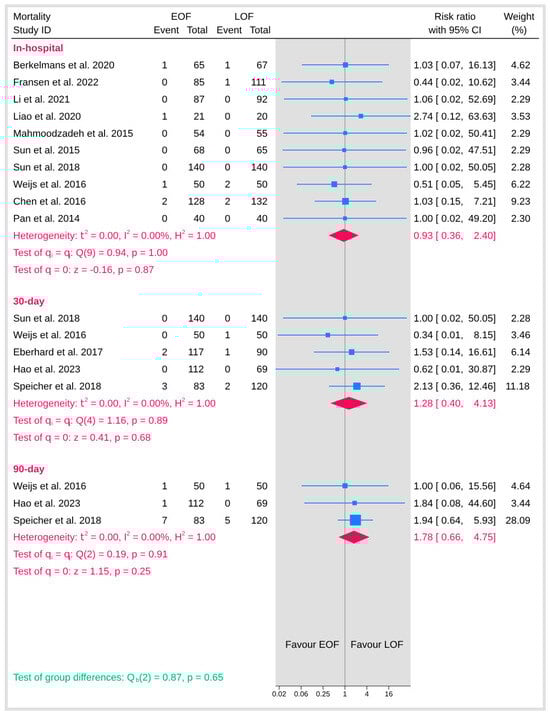 Three studies reported the rate of pneumothorax, with a pooled RR of 1.36 (95% CI: 0.57–3.21; p = 0.49). No heterogeneity was observed (I2 = 0%, p = 0.79). The results suggest no significant difference in pneumothorax risk between EOF and LOF.