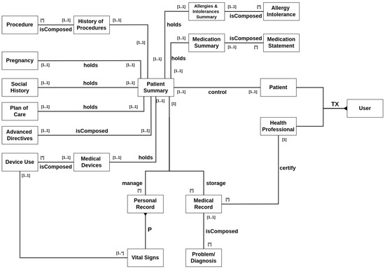 Figure 1 illustrates a conceptual diagram that represents the information. It was structured as follows: Aside from administrative accounts, two types of users can be registered in the system, patients and health professionals. A patient controls exactly one summary, which is his own. A patient summary manages three types of information: patient details, medical records, and personal records.