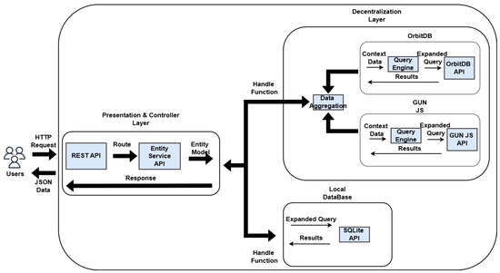 Due to the tools used to develop the decentralized system, there is no guarantee the data can be removed from all nodes in the network, as there could be situations where a node is disconnected when the delete operation is executed, for example. Therefore, the policy adopted was not to implement the delete operation for the decentralized databases. This behavior was mainly built into the query engine, as can be seen in Figure 6.