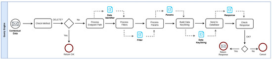 Initially, the system verifies whether the incoming request uses the DELETE method. If so, the engine halts the transformation process and terminates the operation. Subsequently, the request’s identifiers, filters, and parameters are combined to generate a keystring that uniquely identifies the target element of the query. This keystring is then forwarded to the corresponding data repository. In the event of a successful operation, the result is passed back to the middleware layer. If the process fails, the query is aborted to prevent any disruption to local processes. Additionally, every user request is logged in a local storage system to guarantee data durability.