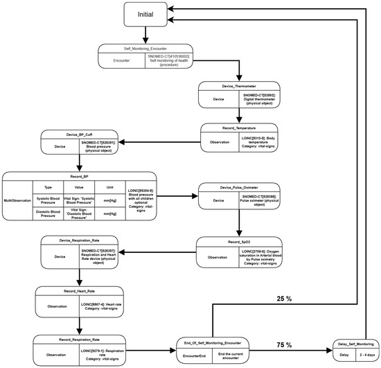 The default modules present on Synthea do not have the capabilities to generate data where patients perform self measures of their vital signs, which would be a setback for our PHR test. So, to fabricate a scenario where the patients have this behavior, we developed a custom module for this experiment called “Self Monitoring Wellness”. This module cycles along during the patient’s lifespan and simulates an encounter where it is assumed the patient takes several measures of their vital signs, using the associated measuring devices, as in Figure 7.