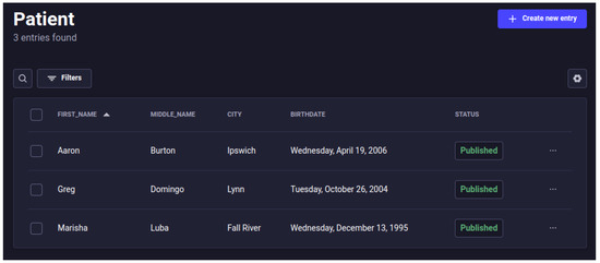 As seen in Table 3, 190 instances of the central entities were registered in the eHealth system. Three patients were registered as specified in the Synthea configuration, also shown in Figure 8, and about 28 other entities, representing the health institutions and their members, were recorded. The 12 devices created correspond to 4 devices (thermometer, blood pressure, oximeter, and heart rate measurer) for each patient. The 123 vital signs registered correspond to 36 records from the patient Aaron, 42 records from the patient Greg, and 45 records from the patient Marisha.