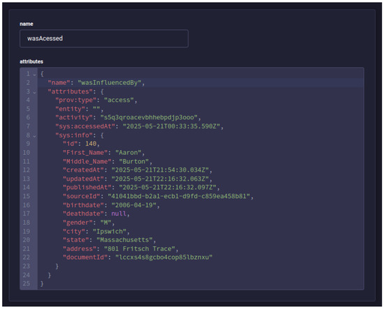 The provenance layer main objective is to offer a reliable mechanism for tracking and auditing the data handled by the platform, particularly focusing on EHR and PHR information. The representation of relationships among agents, activities, and entities—core elements of the PROV model—is illustrated in Figure 3 and Figure 4. Built using the Strapi framework, this layer saves PROV records and their associations in a local data repository. It captures every incoming system request and applies all predefined causal relationships structured within the application model.
