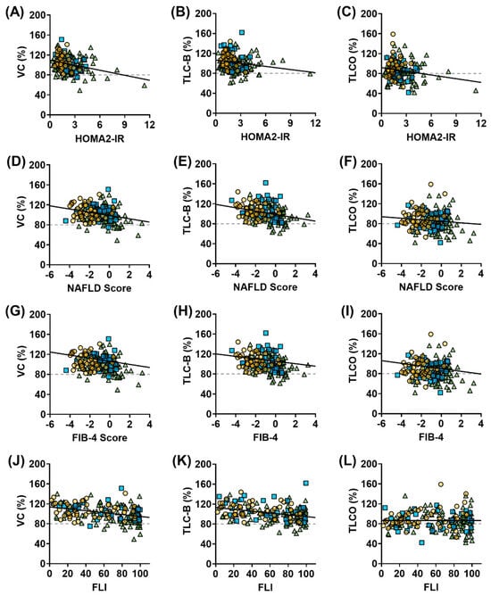 Scatter plots showing the relationships between metabolic markers—HOMA2-IR (A–C), NAFLD score (D–F), FIB-4 (G–I), and FLI (J–L)—and lung function parameters—VC, TLC-B, and TLCO. Each point represents an individual from the study cohort (n = 184): yellow circles indicate NGT participants, blue squares indicate PRED, and green triangles indicate individuals with T2D. Solid black lines represent linear regression trends; dashed gray lines indicate diagnostic thresholds for restrictive lung disease at <80%.