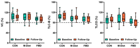 To explore whether individuals with pre-existing restrictive lung function responded differently, a subgroup analysis was conducted in participants with baseline values below diagnostic thresholds for VC, TLC-B, or TLCO (<80%). In the FMD group, 2 of 14 participants had low VC and 2 had low TLC-B at baseline; all 4 showed normalization at follow-up. In the Mediterranean diet group, only one participant had reduced VC or TLC-B at baseline, limiting interpretation. No participants in the control group had reduced VC or TLC-B.