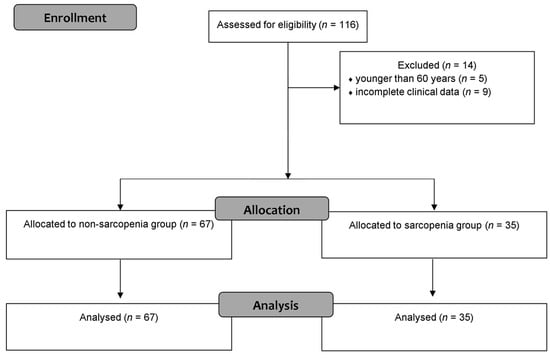During the study period, 116 patients who underwent RFA were assessed for eligibility. Of these, 14 were excluded based on the study criteria: five were under 60 years of age, and nine had incomplete clinical data. Ultimately, 102 patients were included in the final analysis and categorized into two groups: sarcopenia (n = 35) and non-sarcopenia (n = 67) (Figure 1).