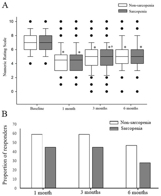 Pain scores and proportion of responders. (A) Numeric Rating Scale scores for back pain. (B) Proportion of responders. * p < 0.05, baseline vs. post-RFAs; Wilcoxon signed-rank test. † p < 0.05, non-sarcopenia vs. sarcopenia; Mann-Whitney U test.