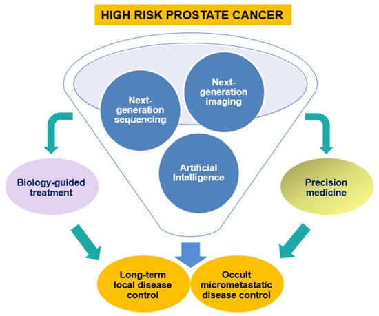 Prostate cancer (PC) is the second most frequent tumor among men worldwide, with an estimated incidence of nearly 1.4 million new cases in 2020, and 7.3% of all newly diagnosed cancers globally in 2022 [1,2]. Localized high-risk PC still accounts for 50–75% of relapse after local primary treatment with curative intent, despite recent advances in diagnosis, and surgical and radiation planning and delivery techniques, owing to increasingly precise and effective treatments [3]. Current guidelines have encoded fairly precise definitions of high-risk PC, based on clinical and pathological staging parameters. D’Amico risk classification is widely adopted by the American Urological Association (AUA), the European Association of Urology (EAU), and the National Institute for Health and Care Excellence (NICE). The presence of clinical T stage ≥ T2c (TNM Staging System, 8th Ed. [4]), Gleason score (GS) ≥ 8, and prostate-specific antigen (PSA) > 20 ng/mL frames this case as high-risk PC. T-stage definition is recommended to be defined on digital rectal examination (DRE), while prostate multiparametric magnetic resonance imaging (mpMRI) can help identify extraprostatic extension of disease, seminal vesicles invasion, and lymph node involvement [5,6,7,8]. The National Comprehensive Cancer Network (NCCN) classification considers high-risk parameters the evidence of extraprostatic extension (clinical T-stage T3a), Gleason score ≥ 8, and PSA ≥ 20 ng/mL, with locally advanced disease (stage cT3b-T4) described as very high-risk PC, instead [9]. Of note, the Radiation Therapy Oncology Group (RTOG) definition considers as high-risk PC any T-stage plus Gleason score ≥ 7 and PSA 20–100 ng/mL, or a clinical T-stage ≥ T2c associated with Gleason score 8–10 and PSA <100 ng/mL [10]. The high rate of clinically relevant treatment failures may be attributable to some main issues. First, aggressive forms of PC drive a high risk of occult micrometastatization (regional and extra-regional lymph nodes, but also distant metastases), which is managed with higher accuracy than in the past thanks to the development of functional imaging with highly prostate tumor-specific radiotracers, namely prostate-specific membrane antigen (PSMA)–positron emission tomography (PET)/computed tomography (CT) [11]. Second, the presence of unfavorable histology patterns. The glomeruloid architecture (the most favorable one) and cribriform, poorly formed, fused patterns are considered different aspects of the Gleason pattern depending on the differentiation grade of the prostatic glandular structure. Attention must be particularly paid to the intermediate risk PC (that is, the International Society of Urological Pathology (ISUP) Grade 2 and 3), as they may unfavorably change the disease prognosis. In particular, the cribriform pattern has been shown to be an independent predictor of recurrence, while the Gleason pattern 4 alone is not [12]. This means that a histologically confirmed PC, Gleason score 3 + 3 with significant cribriform histology, might be at a higher grade and higher risk than a Gleason score 3 + 4 with a less represented cribriform pattern. Additionally, the bi-allelic loss of breast cancer gene 2 (BRCA2) has been associated with a greater extension of the invasive cribriform and intraductal patterns within prostate biopsy specimens, and confirms that the cribriform pattern is suggestive of high-grade PC [13]. Not less important, prostate cancer susceptibility is mainly influenced by aberrations in the homologous recombination repair (HRR) genes (DNA damage repair genes BRCA1/2, DNA damage response gene ataxia-telangiectasia mutated (ATM), partner and localizer BRCA2 (PALB2) and RAD51) and mismatch repair (MMR) genes (MutL protein homolog (MLH)1, MSH2, MSH6, postmeiotic segregation increased 2 (PMS2)). Germline BRCA2 gene mutations have been associated with a higher risk of PC, increased mortality, and earlier age of diagnosis. BRCA1 mutations also increase the risk of PC, although to a lesser extent. Alterations in the ATM, phosphatase and tensin homolog (PTEN), and MYC proto-oncogene have predictive power for the existence of high-grade disease, including occult oligometastases at the time of radical prostatectomy (RP) [14]. Alterations in the DNA repair through phosphorylation of gene checkpoint kinase 2 (CHEK2) or tumor suppressor genes like homeobox B13 (HOXB13) may also occur [15].