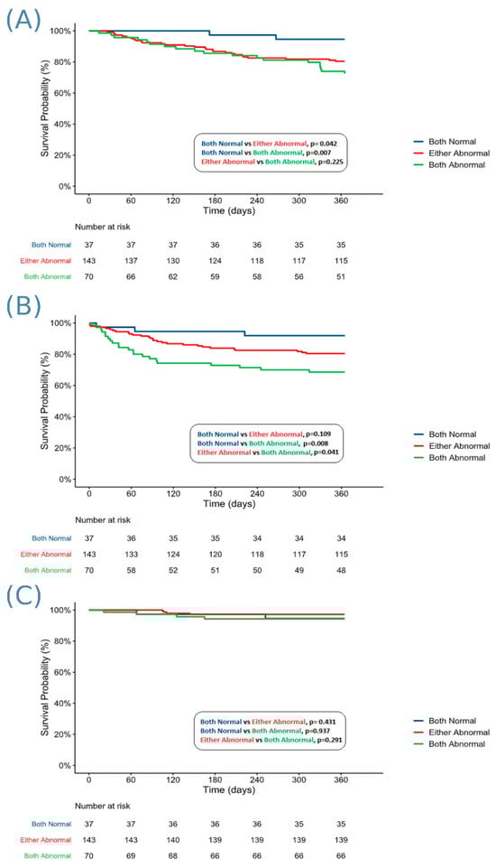 Figure 1. Kaplan–Meier survival curves comparing the survival free from (A) mortality, (B) MACE, and (C) MV reintervention between patients who had both the parameters normal (VTIMV/LVOT < 2.5, ECG-AI score ≤ 1), either parameter abnormal (VTIMV/LVOT ≥ 2.5, ECG-AI score > 1), or both parameters abnormal (VTIMV/LVOT ≥ 2.5 and ECG-AI score > 1).