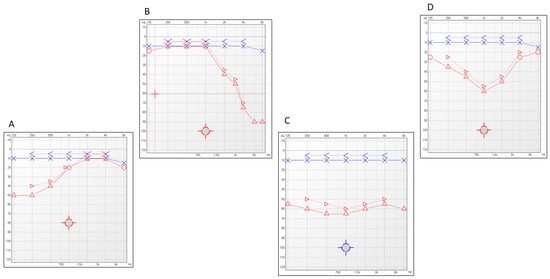 Representative examples of audiometric configurations observed at diagnosis. Four distinct patterns are illustrated: (A) Upsloping—characterized by greater hearing loss at lower frequencies with improvement at higher frequencies; (B) ownsloping—greater hearing loss at higher frequencies; (C) flat—similar hearing thresholds across all tested frequencies; (D) U-shaped thresholds at mid-frequencies compared with low and high frequencies.