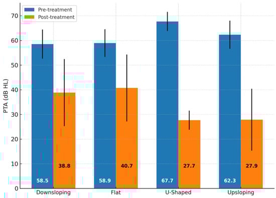 Comparison of pre- and post-treatment pure-tone average (PTA) values across audiogram shape subgroups. Mean PTA values before and after treatment are reported for downsloping, flat, U-shaped, and upsloping audiometric configurations. Baseline PTA values were broadly comparable across groups (mean range: 58.5–67.7 dB HL). Differences in PTA improvement were observed, with upsloping and U-shaped patterns showing greater post-treatment recovery compared with flat and downsloping patterns. No significant differences were detected in baseline PTA values across groups (one-way ANOVA, p = 0.12). Error bars indicate standard deviation. Abbreviations: PTA = pure-tone average; dB HL = decibels hearing level.