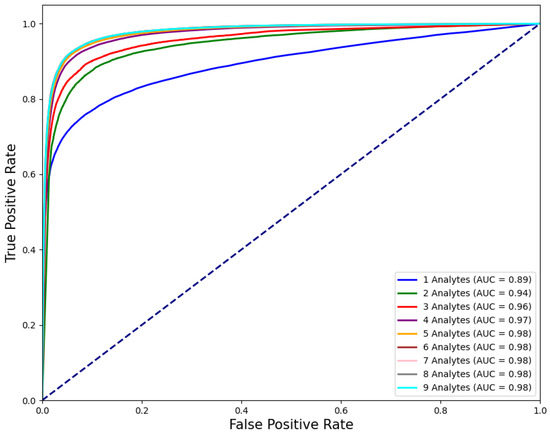ROC curves of the models that are trained on analyte combinations that yield the best performance for each n.