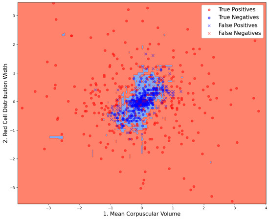 The models in this study produce class probabilities for each data point, representing the likelihood of the sample belonging to the WBIT class. A probability threshold (set to 0.5 throughout this study) is then used to assign class labels. This threshold directly influences the size of the decision regions: increasing the threshold reduces the size of the WBIT (blue) area, resulting in fewer false positives but more false negatives. The appropriate threshold should be chosen according to the laboratory’s tolerance for these trade-offs. False negatives, on the other hand, are primarily located within the central region of the true negative cluster in Figure 3. These errors appear more difficult to eliminate using only two analytes. It is plausible that, in these WBIT cases, the mismatched patients happened to have very similar blood profiles, making the error more difficult to detect. The consistently lower sensitivity compared to other scores observed in Figure 3 can be explained by the underlying data distribution (Figure 3 and Figure 4): the non-WBIT (negative) class forms a tightly clustered group, while the WBIT (positive) class is more dispersed. This asymmetry in spatial density increases the model’s tendency to misclassify WBIT data points, thereby lowering sensitivity.