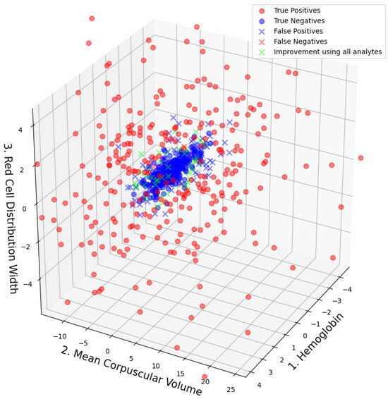 Inspection of the misclassified data points in Figure 3 and Figure 4 reveals that most false positives are located near the cluster of true negatives. This is expected, as data points from both classes overlap in these regions, increasing the likelihood of classification errors. Although a direct visualization is not possible for , it can be inferred from Figure 3 that the green data points—representing samples misclassified by the model but correctly classified by the model—are likely located farther from the cluster center in the higher-dimensional space. This spatial separation may allow the model trained on all nine analytes to distinguish such points more effectively. The boundaries between the blue and red decision areas in Figure 3 can be interpreted as complex, multi-analyte delta check rules. Each straight boundary segment corresponds to a single rule associated with the analyte to which it is perpendicular.