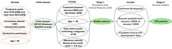 - Confirmed AS diagnosis. Patients were required to have a confirmed diagnosis of AS based on TTE findings (Vmax ≥ 2.0 m/s) at the time of inclusion in 2009, ensuring a homogeneous cohort with verified AS for survival analysis.