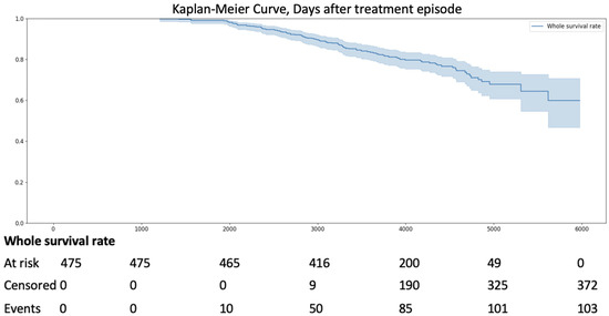 The survival model was validated based on the patient cohort where the observation started from 2009 (n = 475) and ended on 1 January 2025 using the Kaplan–Meier method, which calculates survival as the product of survival probabilities at specific time points when events occur [18].