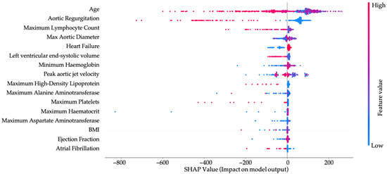 The SHAP summary plot illustrates the contribution of individual features to the model’s prediction of patient survival (Figure 4).