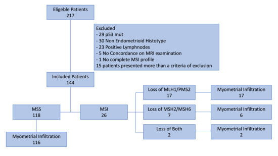 Our retrospective observational cohort study, conducted at our institutions between August 2022 and October 2024, selected 217 patients and examined the MMRPs of 144 patients undergoing surgery for clinical stage I low-grade endometrial cancer, with no evidence at MRI of myometrial infiltration. The sample was stratified according to microsatellite stability: 118 MSS vs. 26 MSI. Further, patients with MSI were stratified on the basis of heterodimers involved in loss of function: 17 Loss of MLH1/PMS2, 7 Loss of MSH2/MSH6, and 2 with loss of both. The causes of inclusion and exclusion are shown in Figure 1.