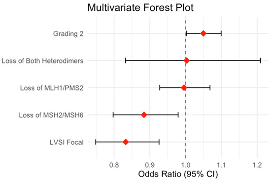 The results of the multivariate logistic regression model assessing the association between MMR heterodimer loss and myometrial infiltration are visually summarized in Figure 2, using a forest plot.