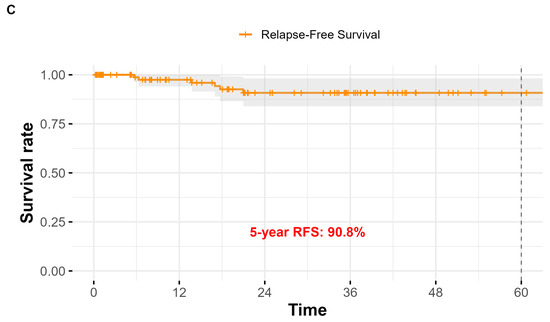 Additional statistical analyses were performed using R (version 4.4.3; R Core Team, 2024) [23] with RStudio software (version 2025.05.1+513; Posit Team, 2023) [24]. Kaplan–Meier survival curves for overall survival (OS), disease-specific survival (DSS), and relapse-free survival (RFS) were generated using the survival and survminer [25] packages. Graphs were combined and annotated with ggplot2 [26], ggpubr [27], dplyr [28], and scales [29]. A post hoc power analysis was performed using the pwr [30] package in R, specifically the function pwr.2p2n.test, o calculate the statistical power for differences between two independent proportions based on Cohen’s h effect size. Multivariable logistic regression models were fitted in R using the broom [31] and dplyr citepref30 packages for model tidying and data manipulation. Odds ratios (ORs) with 95% confidence intervals were derived from model coefficients using the exp() transformation. When no events occurred in one of the exposure groups, estimates were reported as “Not estimable” (NE).
