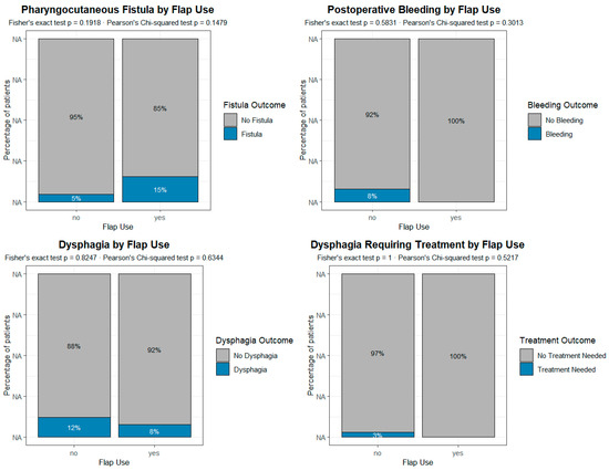 Analysis of the impact of the reconstructive procedure on the different complications and sequelae in patients undergoing primary voice prosthesis placement. According to the present data, the reconstruction with pectoralis major is not associated with any of the most common complications/sequelae. Each plot represents a grouped proportional bar chart, built from contingency tables comparing the incidence of post-surgical complications between patients who underwent flap reconstruction and those who did not. For each complication, the x-axis indicates the presence or absence of flap use (“Flap Use”: Yes/No), while the y-axis represents the percentage of patients within each flap group. Each vertical bar is divided into segments corresponding to the outcomes of the postoperative variable (e.g., “Fistula” vs. “No Fistula”), and the height of each segment reflects its relative proportion within the flap group.