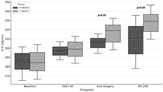 IL-6 levels over time by INVOS group. Footnote: OLV + 30: After 30 min of one-lung ventilation; TLV: Two-lung ventilation; PO: Postoperative. p < 0.05: High INVOS vs. Low INVOS groups.