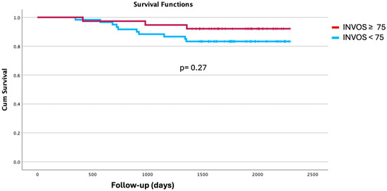 Length of hospital stay was significantly shorter in the H-INVOS group (median 4 [IQR 3–6] days) compared with the L-INVOS group (5 [4–6.5] days; p = 0.019). Although no statistically significant differences were observed in the distribution of Clavien–Dindo complication grades, 71% of patients in the H-INVOS group experienced no complications versus 55% in the L-INVOS group (p = 0.112). All four cases of major postoperative complications occurred in the L-INVOS group. No significant differences were found in the detailed analysis of postoperative complications (Table 4). Kaplan–Meier survival analysis likewise showed no significant differences between groups (log-rank p = 0.27; Figure 3).
