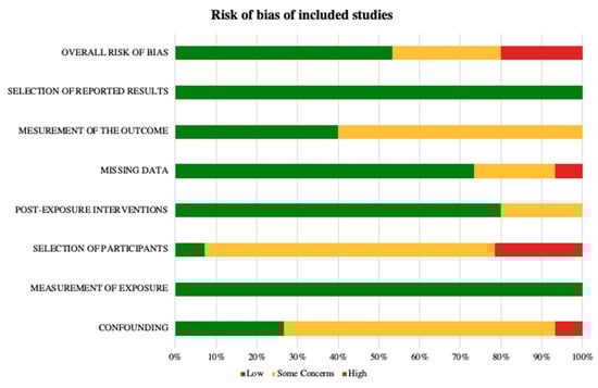 The risk of bias assessment of the included studies showed that most studies had “some concerns” in at least one domain, particularly regarding participant selection and confounding. Only a few studies were rated as “high risk” in specific domains [34,35,40]. More recent study [46] was rated as low risk across all domains, probably indicating an improvement in methodological quality. Overall, the available evidence is considered of moderate methodological quality, with heterogeneity in risk of bias reflecting differences in study design, assessment methods, and reporting practices.