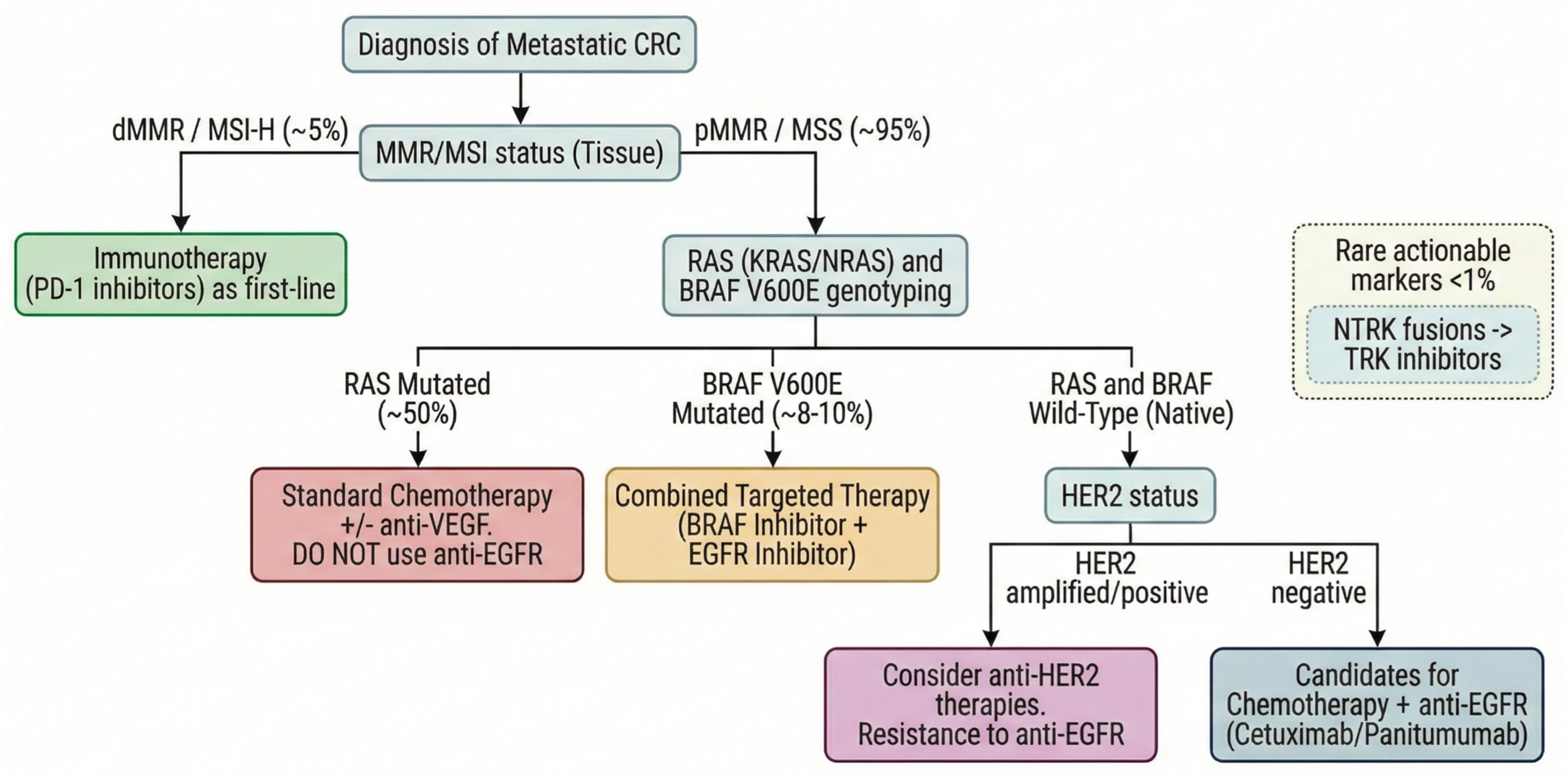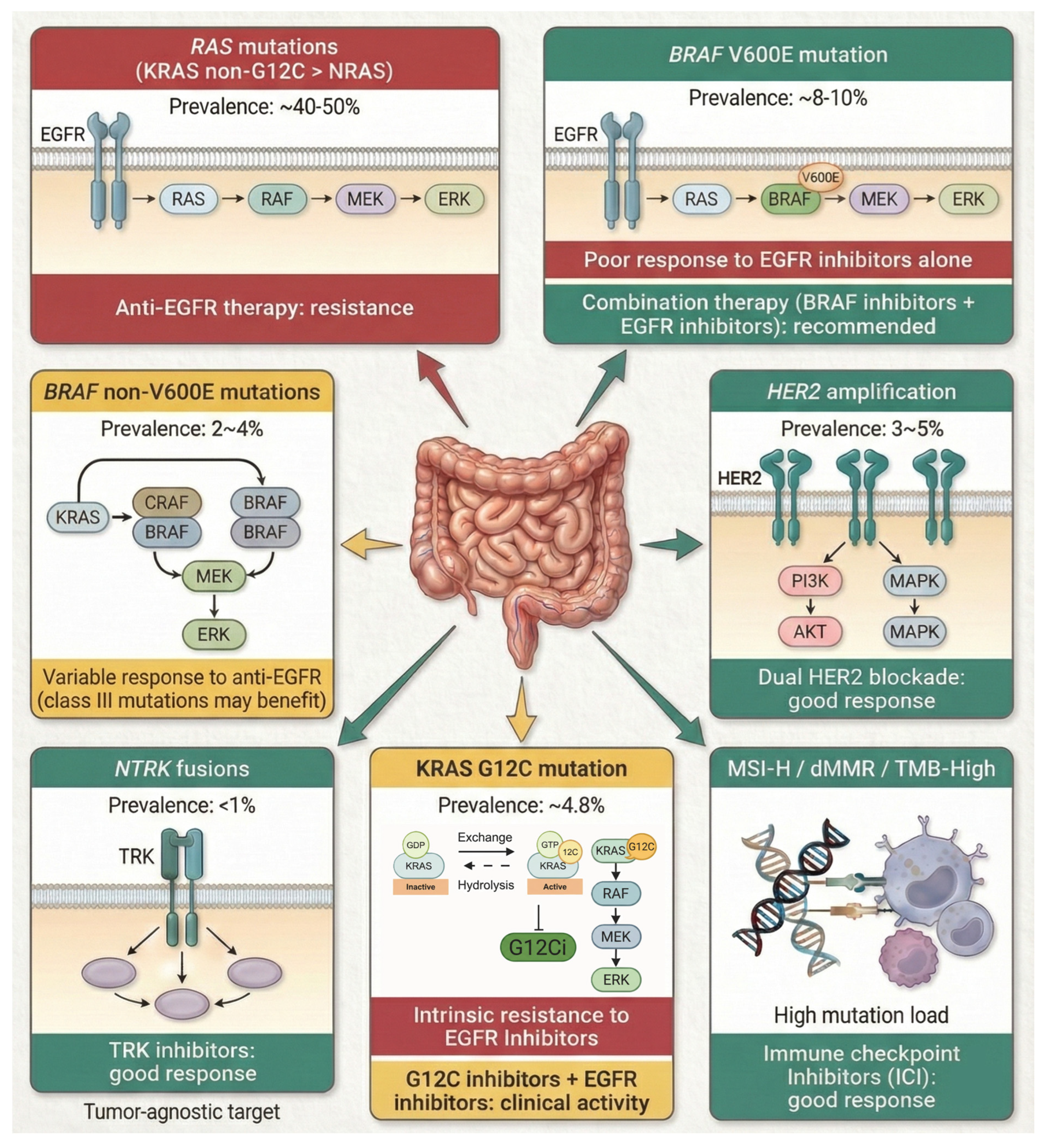| HER2 amplification | Heterodimerization with EGFR or independent signaling activation. | IHC/ISH/NGS | Predictive of anti-EGFR resistance. Actionable target with dual HER2 blockade (e.g., trastuzumab + lapatinib/tucatinib). |