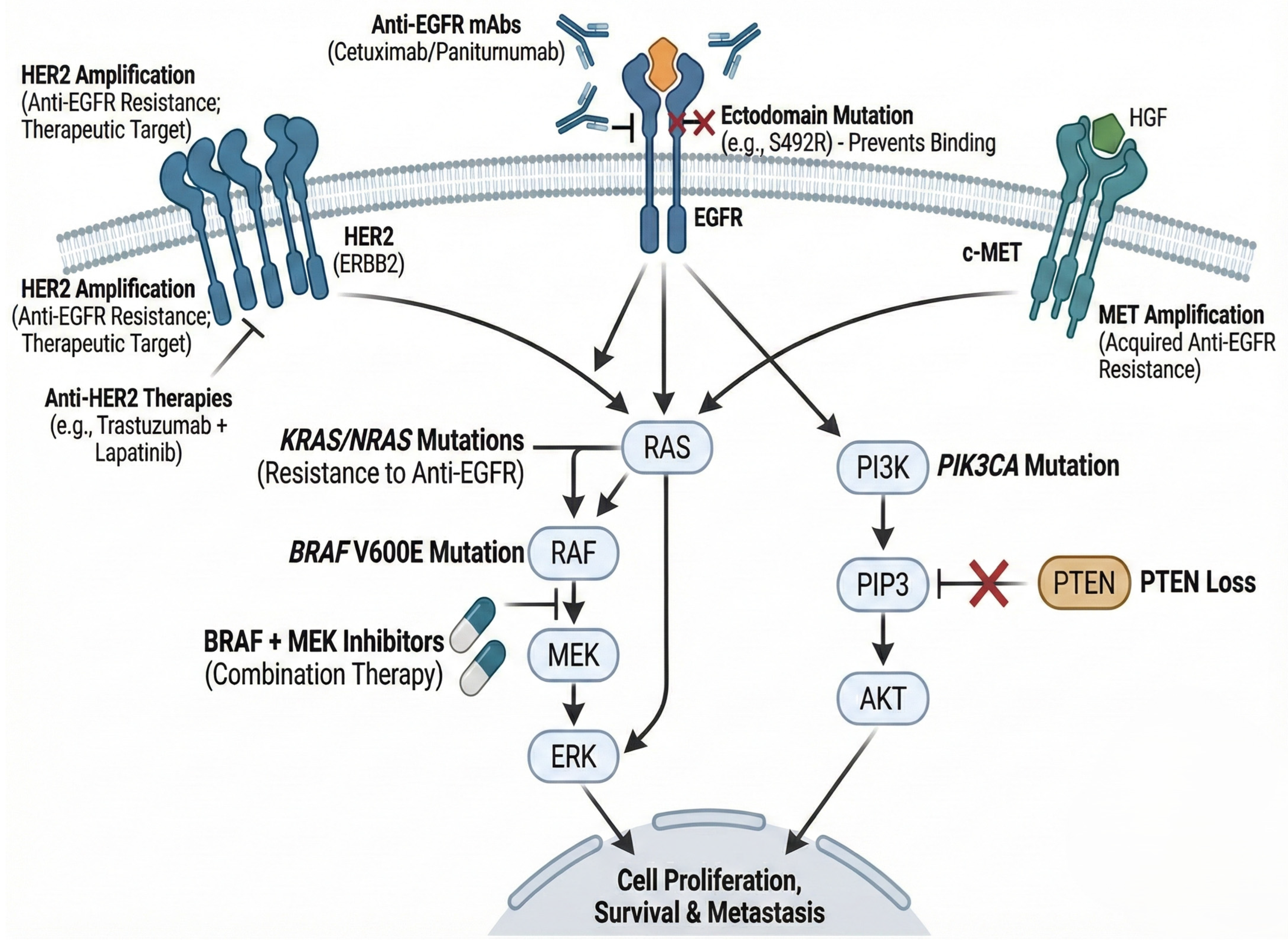 | MET amplification | Bypasses EGFR blockade via activation of parallel PI3K/AKT/MAPK signaling. | FISH/NGS (tissue or ctDNA) | Found in up to 18% of acquired resistance cases without RAS/RAF mutations nor microsatellite instability. Potential target for MET inhibitors (e.g., capmatinib) + anti-EGFR. |