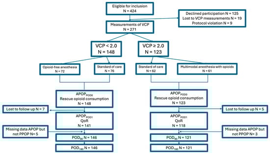 Inclusion flow-chart. Abbreviations: APOP; acute postoperative pain, POD; postoperative day, QoR; quality of recovery, VCP; venous cannulation pain, PPOP; Persistent Postoperative Pain.